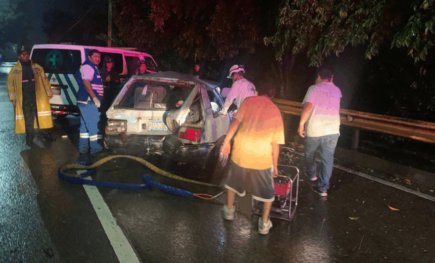 #Nacional l Cuatro lesionados dejó un fuerte accidente en km 18 de la Autopista Comalapa. Cruz Verde utilizó equipo hidráulico para rescatar a víctimas atrapadas.
