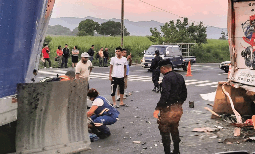 #Accidente l Una persona resultó lesionada tras el choque de dos rastras y un camión en el km 45 de la carretera a Sonsonate.