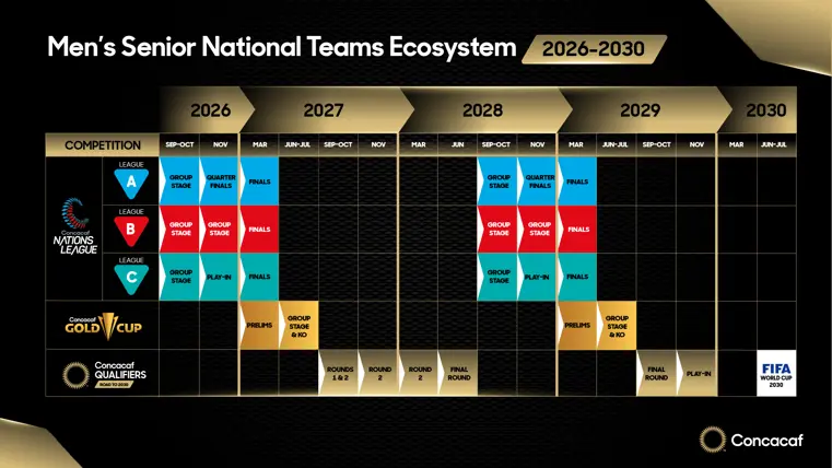 La Concacaf oficializó este 6 de febrero el calendario de competencias para las selecciones nacionales masculinas mayores durante el ciclo 2026-2030, que incluye dos ediciones de la Liga de Naciones, dos Copas Oro y un formato renovado de clasificación a la Copa Mundial de la FIFA 2030, según informó la Confederación.