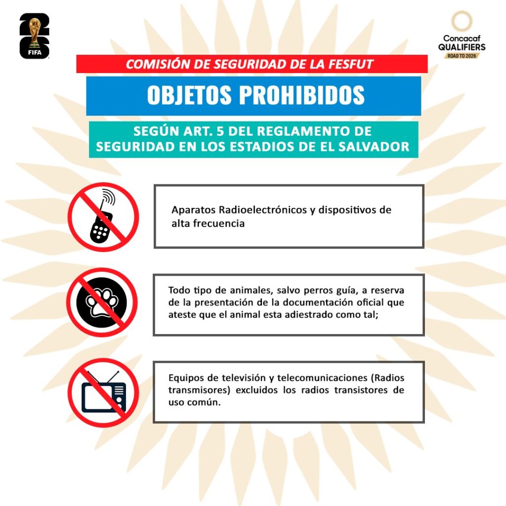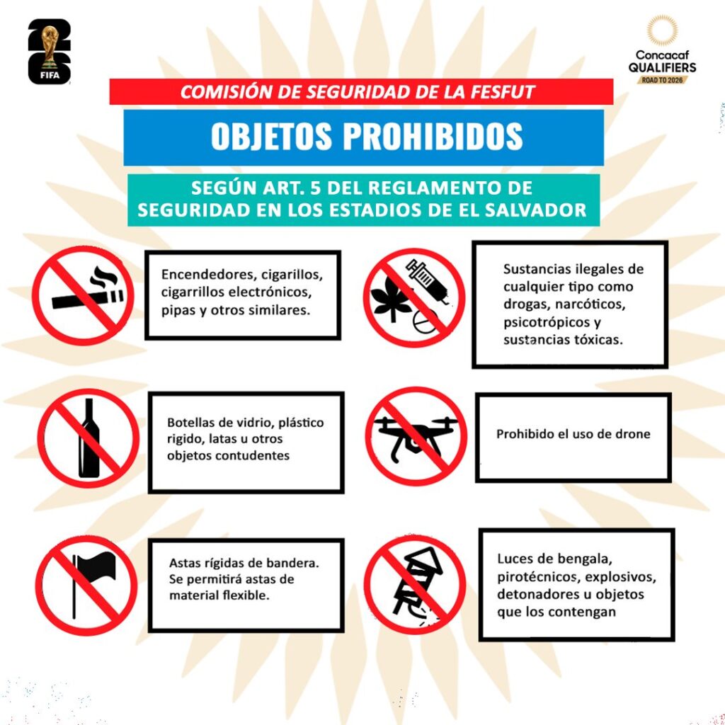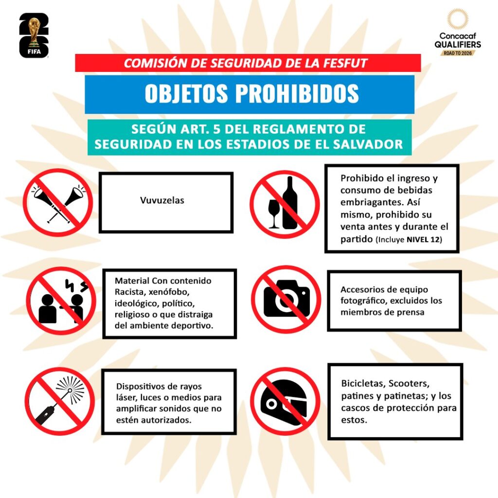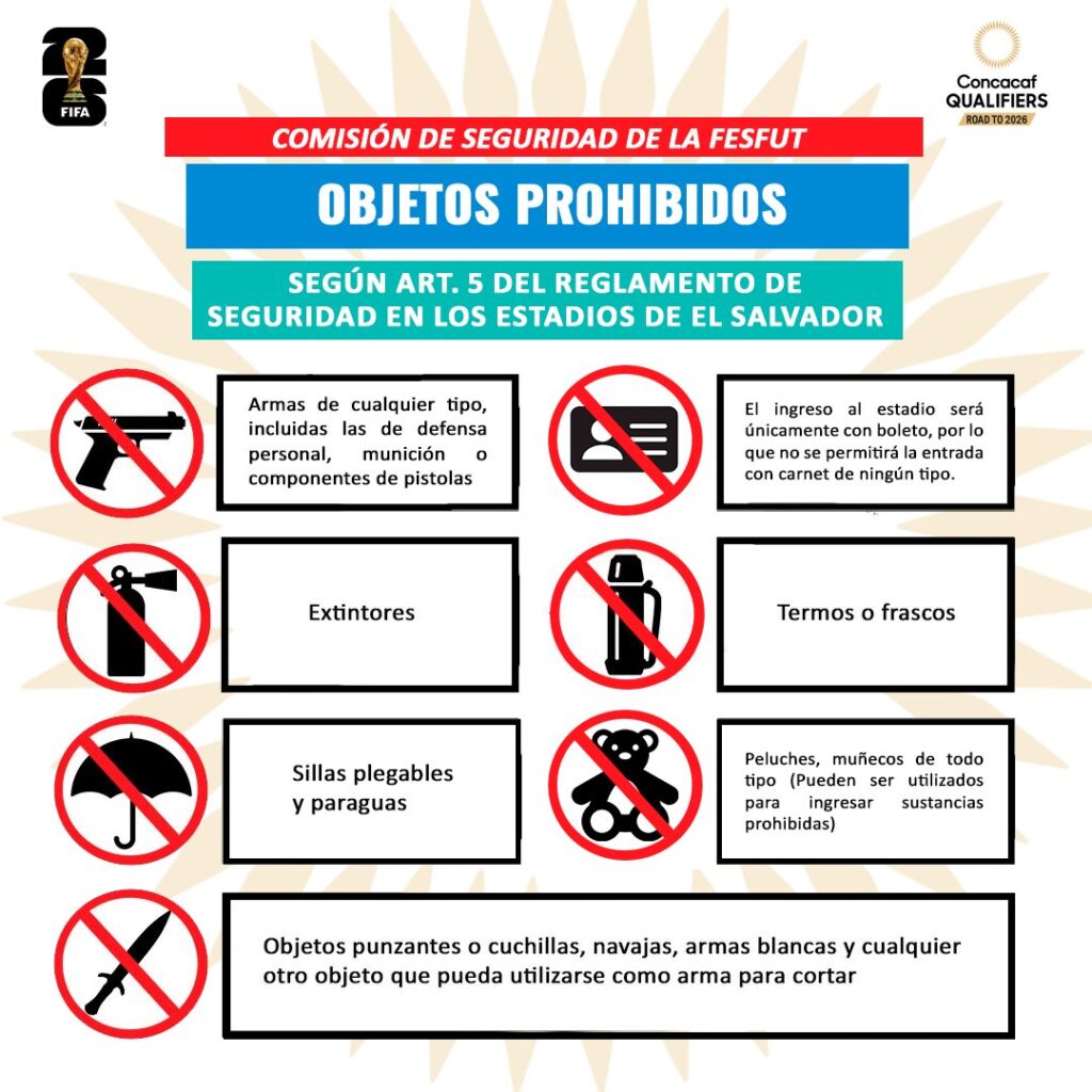 Con el objetivo de garantizar la seguridad y mantener un ambiente deportivo libre de violencia y discriminación, la Comisión de Seguridad de la Federación Salvadoreña de Fútbol (FESFUT) emitió una serie de prohibiciones para el partido entre El Salvador y Panamá, correspondiente a las eliminatorias rumbo al Mundial 2026.