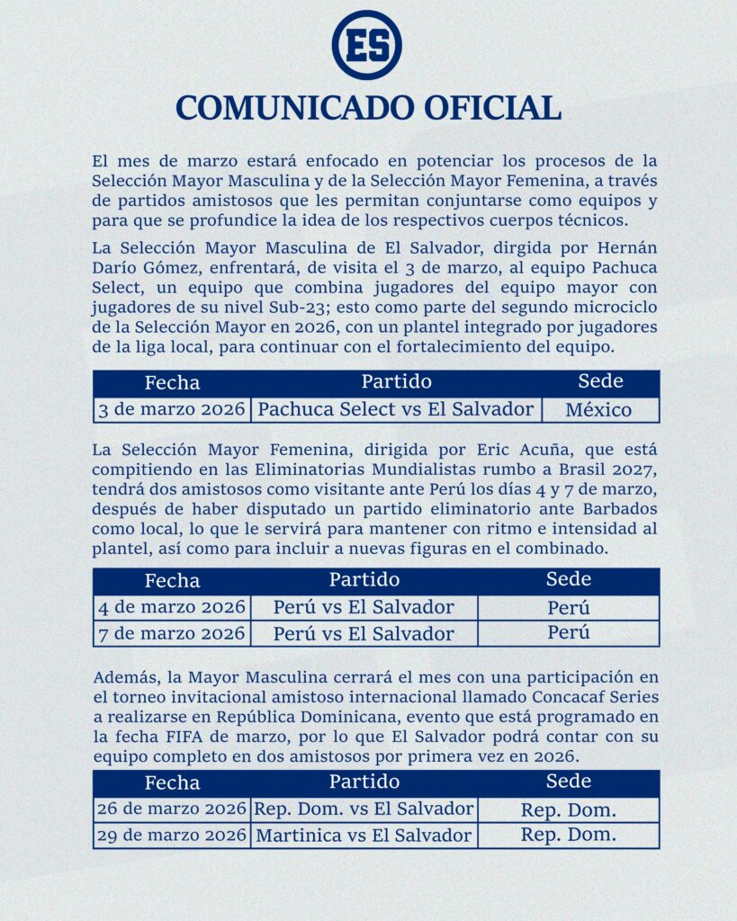 La agenda de la selección masculina cerrará con su participación en el torneo amistoso internacional Concacaf Series, en República Dominicana, durante la fecha FIFA. El Salvador jugará el 26 de marzo ante República Dominicana y el 29 frente a Martinica, lo que permitirá contar con el plantel completo por primera vez en el año.