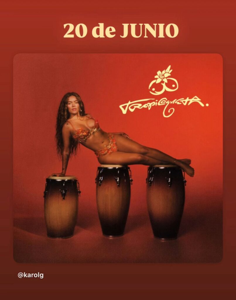 En el clip de casi 50 segundos, Karol aparece con un look deslumbrante inspirado en íconos latinos con un toque moderno y atrevido. La cantante luce un conjunto naranja vibrante, cocos en el brasier, bongós en la cintura y una actitud festiva que anticipa la esencia de “Tropicoqueta”: tropical, femenina y poderosa.