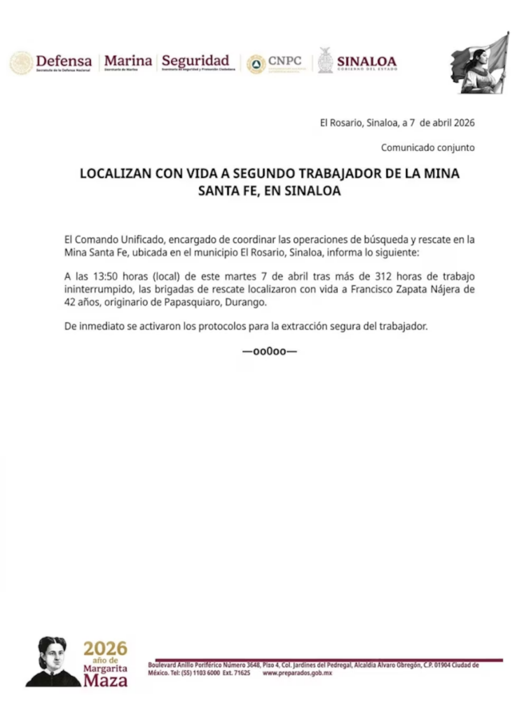El segundo minero atrapado en la mina Santa Fe, en el municipio de El Rosario, Sinaloa, fue localizado con vida este martes 7 de abril, de acuerdo con el Comando Unificado que coordina el operativo de rescate.