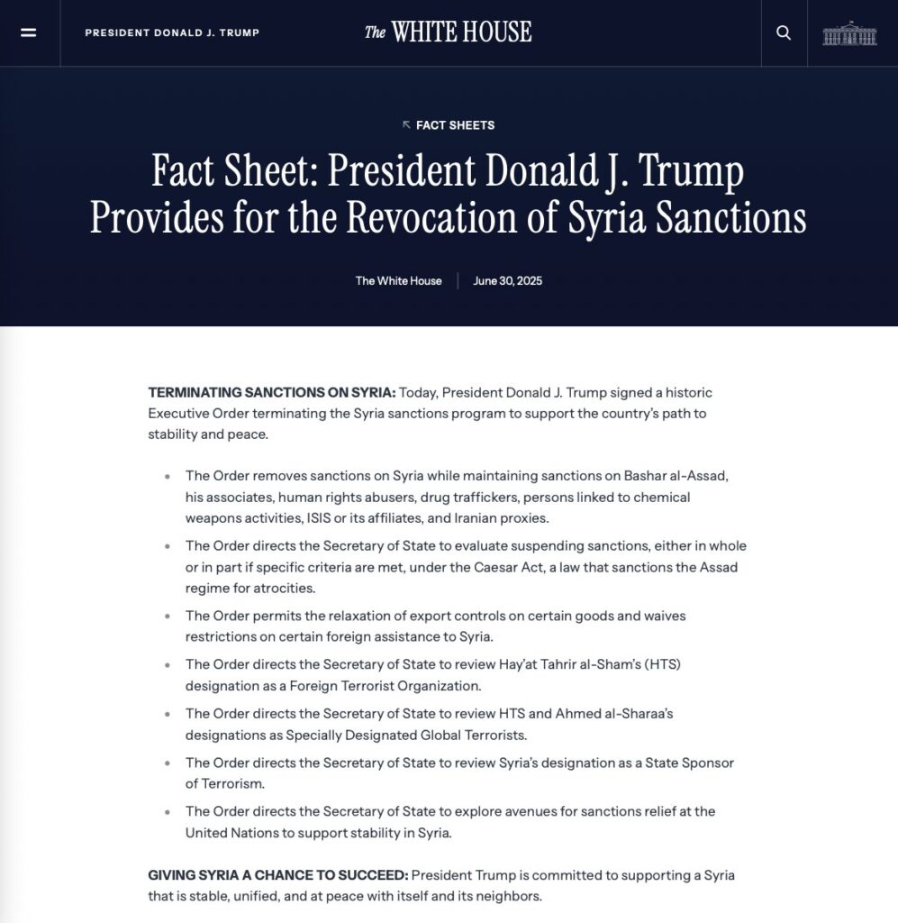 La medida, que entrará en vigor mañana, excluye de este levantamiento al depuesto presidente Bashar al Asad, así como a sus allegados, violadores de derechos humanos, narcotraficantes, actores vinculados a armas químicas, el grupo ISIS, sus afiliados y representantes iraníes. Así lo informó la Casa Blanca a través de un comunicado oficial.