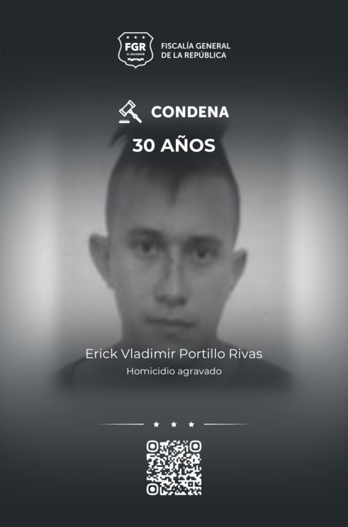 El Tribunal Primero de Sentencia de San Miguel impuso una condena de 30 años de prisión contra Erick Vladimir Portillo Rivas por el delito de homicidio agravado, cometido en octubre de 2018.
