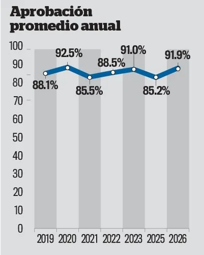 La serie histórica de la encuesta muestra que el nivel de aprobación actual se encuentra entre los más altos registrados desde el inicio del mandato. Según LPG Datos, el punto máximo se alcanzó en 2020, durante la pandemia de Covid-19, cuando el promedio anual fue de 92.5 %.