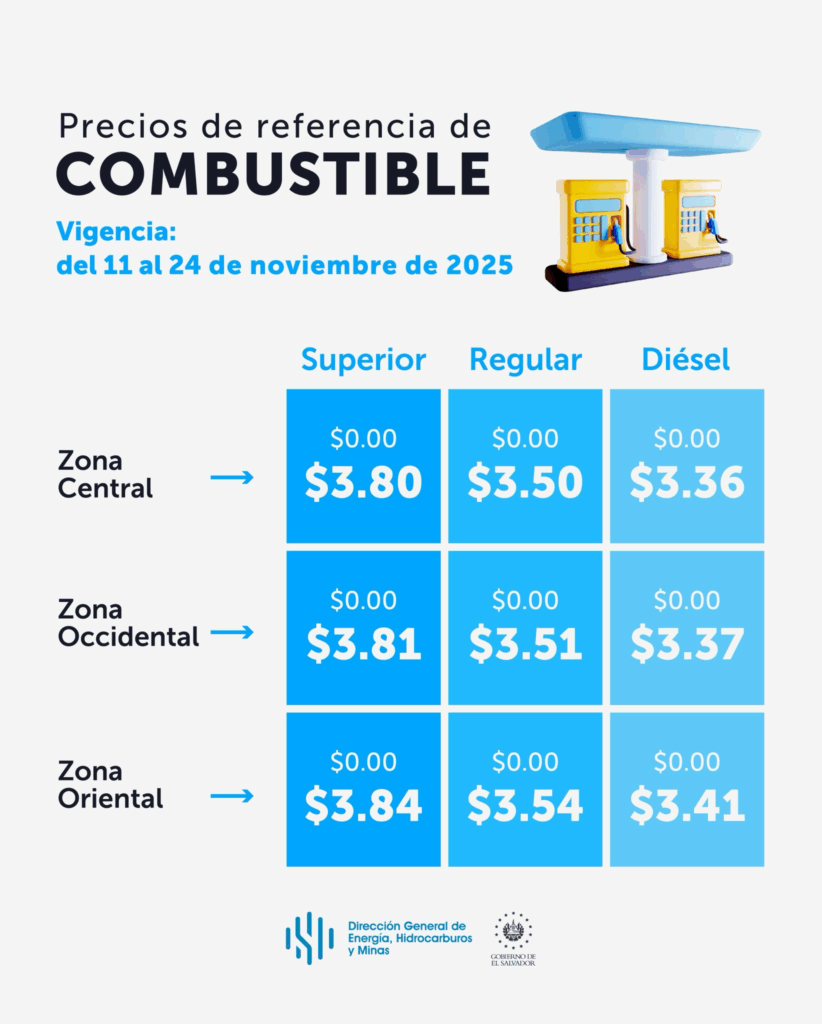 Para la gasolina superior, los valores establecidos son de $3.80 en la zona central, $3.81 en la zona occidental y $3.84 en la zona oriental. En el caso de la gasolina regular, los precios de referencia se ubican en $3.50 para la zona central, $3.51 para la zona occidental y $3.54 en la zona oriental.