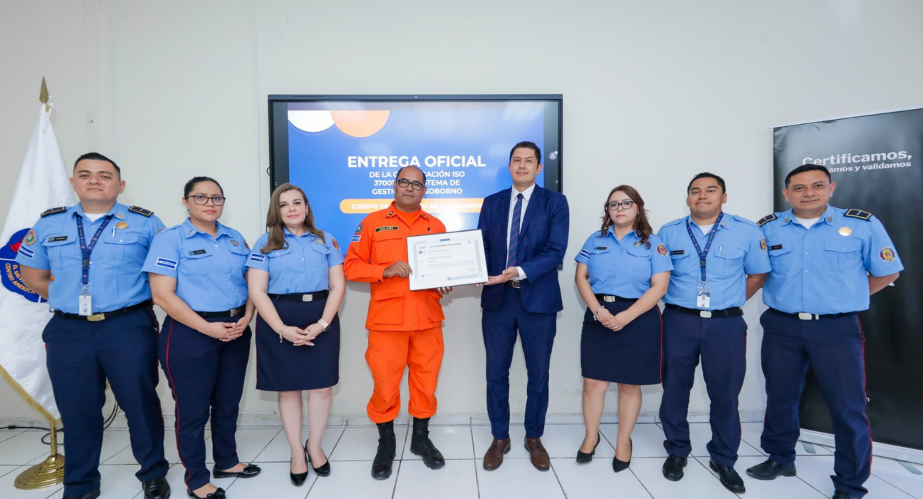 El Cuerpo de Bomberos de El Salvador informó que recibió la certificación internacional ISO 37001 del Sistema de Gestión Antisoborno, otorgada por la empresa certificadora LSQA.