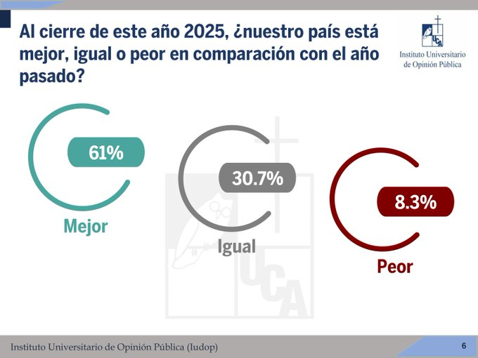 El sondeo también consultó a la población si consideraba que el país estaba mejor o peor al cierre de 2025 en comparación con 2024. Según los datos, el 61 % respondió que estaba mejor, el 30.7 % indicó que no, y el 8.3 % consideró que la situación era peor.