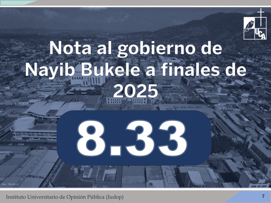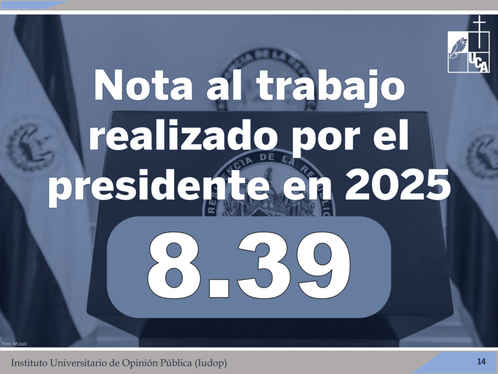 Los resultados de la encuesta del Instituto Universitario de Opinión Pública (Iudop), elaborada con datos de personas encuestadas en 2025, muestran una valoración de 8.39 puntos para el trabajo del presidente, Nayib Bukele, según el estudio.