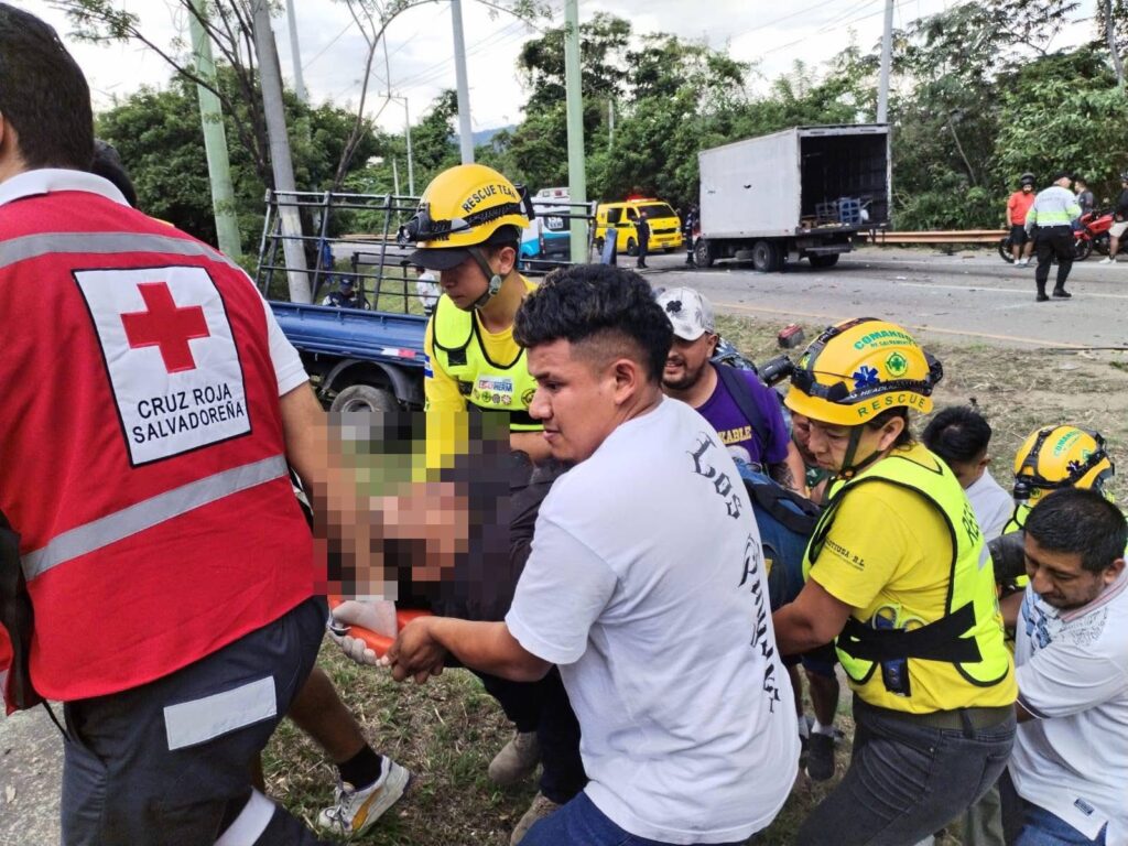 Elementos de Cruz Verde Santa Anita y Cruz Verde Antiguo Cuscatlán brindaron atención en el lugar. Una de las víctimas quedó atrapada entre la estructura de uno de los camiones, por lo que fue necesaria la intervención de socorristas y personas que se encontraban en la zona para liberarla.