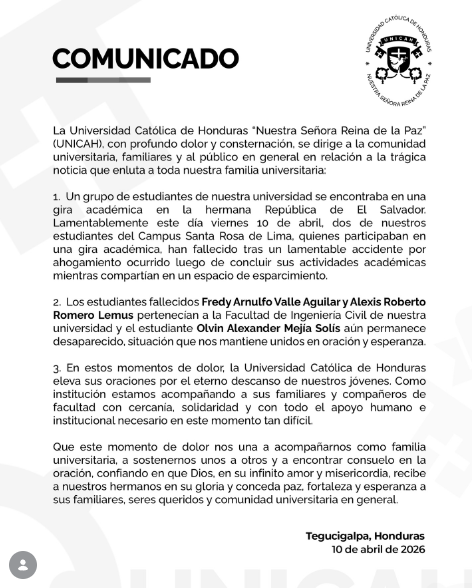 Al menos dos universitarios hondureños fallecieron por ahogamiento el viernes 10 de abril en una playa de La Libertad, mientras un tercer estudiante continúa desaparecido, de acuerdo con un comunicado de la Universidad Católica de Honduras (UCH).