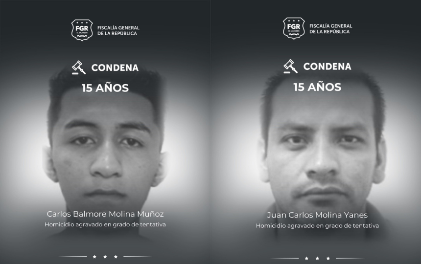 El Tribunal de Sentencia de La Unión condenó a 15 años de prisión a Juan Carlos Molina y Carlos Balmore Molina por el delito de tentativa de homicidio, ocurrido en 2019, informó la Fiscalía General de la República (FGR).
