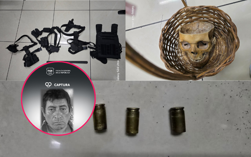 Además, se localizaron tres casquillos de 9 mm, un chaleco táctico, un arnés con funda, tres porta cartuchos, dos porta cargadores, un cinturón negro con su respectiva funda y una piernera, así como tres teléfonos celulares de distintas marcas y una tableta.