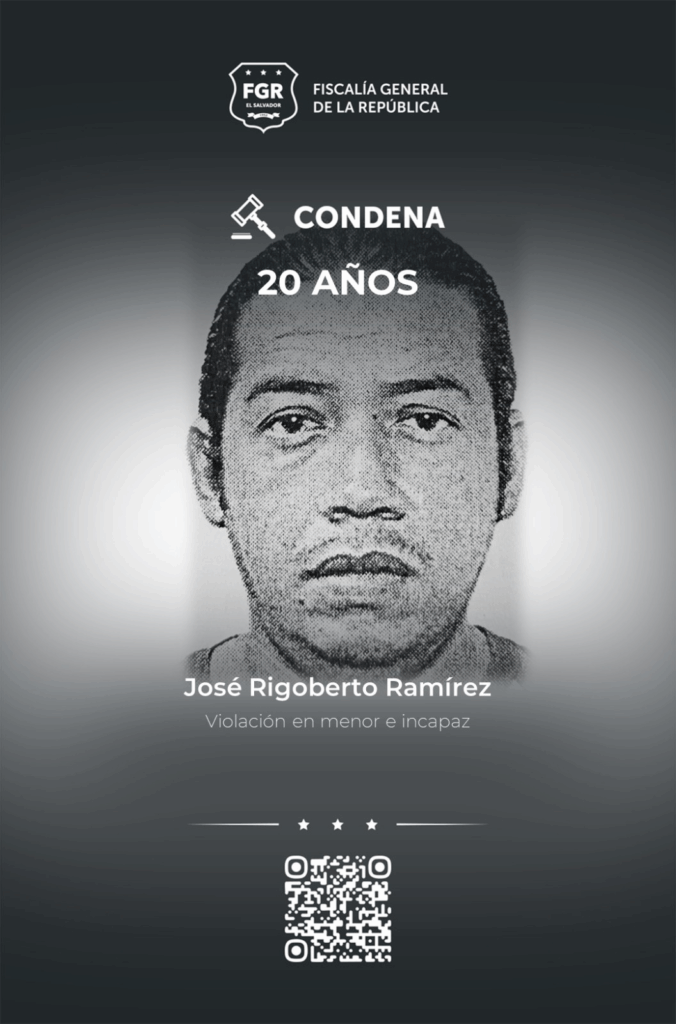 El Tribunal Quinto de Sentencia de San Salvador condenó a José Rigoberto R., a 20 años de prisión por el delito de violación en perjuicio de una niña.