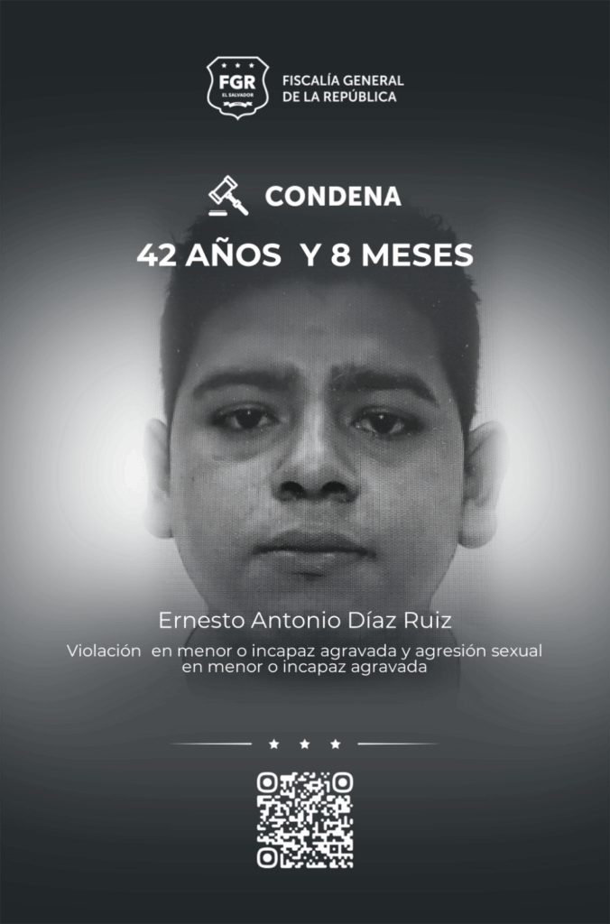 La FGR informó que el Tribunal de Sentencia de Usulután evaluó las pruebas presentadas en el juicio y declaró culpable a Díaz Ruiz por ambos delitos, imponiéndole la pena que supera los 42 años de prisión.