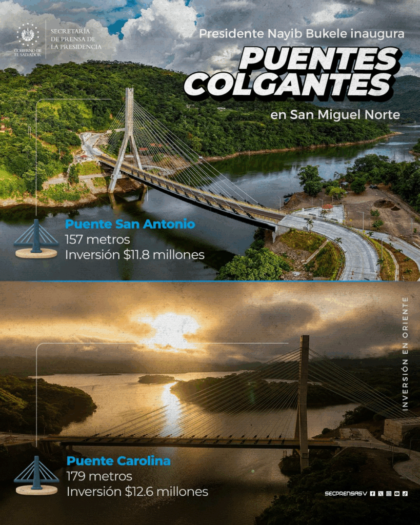 El presidente de la República, Nayib Bukele, inauguró el martes 12 de agosto de 2025, los nuevos puentes atirantados San Antonio y Carolina, dos infraestructuras modernas y únicas en la región, para mejorar la conectividad del norte de San Miguel y Morazán.
