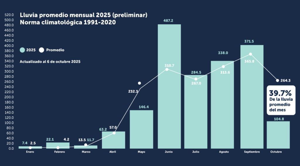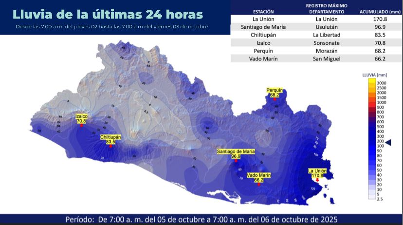 López detalló que en los primeros días de octubre se ha registrado el 39.7 % de la lluvia promedio del mes, con acumulados significativos como 229 milímetros en La Unión, 171 milímetros en Cabañas y 152 milímetros en Usulután.