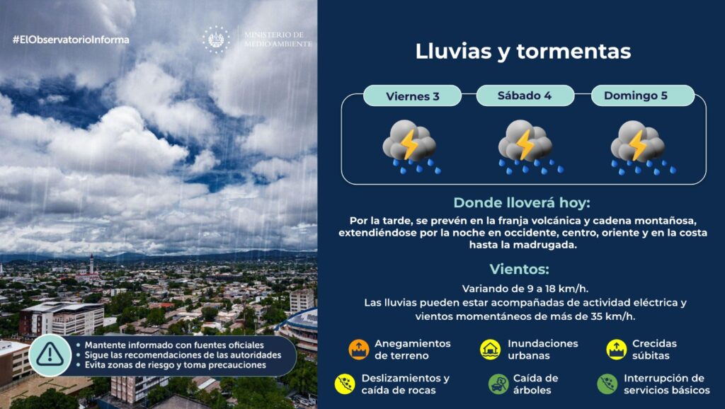 “Esta tarde, tendremos lluvias en la franja volcánica y cadena montañosa, extendiéndose por la noche hacia el resto del país” dijo, haciendo énfasis en el riesgo de zonas como el Área Metropolitana de San Salvador, las zonas norte y costera.