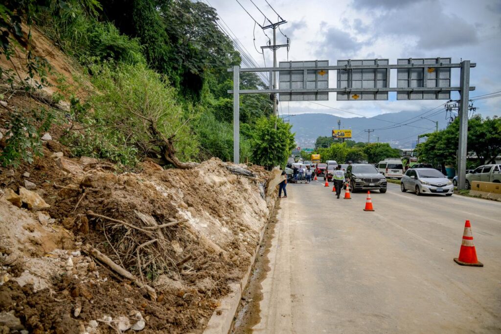 Las cuadrillas realizaron labores de limpieza y remoción de cables eléctricos con apoyo de la distribuidora de energía, lo que permitió habilitar el tráfico en la zona. Ahora se ejecutan intervenciones para prevenir futuros deslizamientos, incluyendo perfilado del talud, colocación de malla metálica, drenajes y lanzado de concreto en 1,250 metros cuadrados.