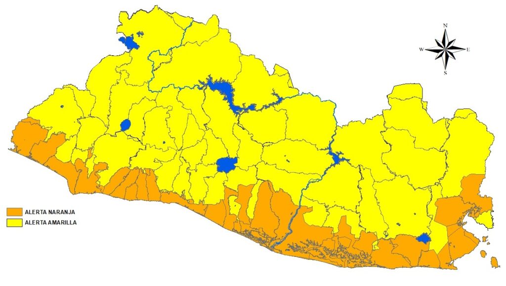 La Dirección General de Protección Civil emitió este martes una Alerta Estratificada, con alerta naranja en los 13 municipios de la franja costera y alerta amarilla en el resto del país, ante el acercamiento de la Zona de Convergencia Intertropical (ZCIT) y una amplia área de baja presión en el océano Pacífico, según el informe especial meteorológico No. 5 del Ministerio de Medio Ambiente y Recursos Naturales (MARN).