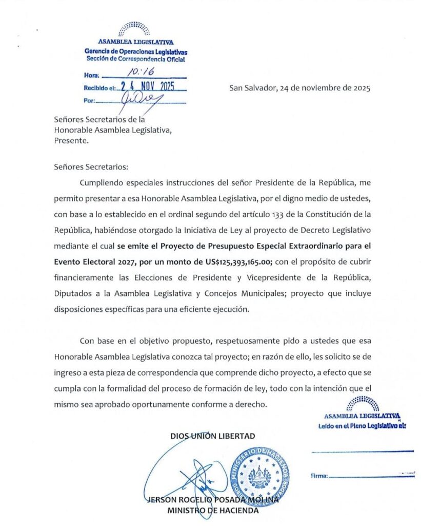 El Tribunal Supremo Electoral (TSE) estima que las elecciones de 2027 requerirán un presupuesto total de $172.1 millones, de acuerdo con la información remitida por el Ministerio de Hacienda a la Asamblea Legislativa. Los comicios incluirán la elección de presidente, vicepresidente, diputados y concejos municipales.