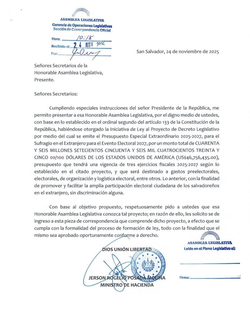 Hacienda también solicitó reformar el presupuesto vigente de 2025 para incorporar $40 millones vinculados al voto desde el exterior, con el fin de contratar a la empresa encargada de implementar los sistemas de votación y los servicios tecnológicos necesarios para el proceso.