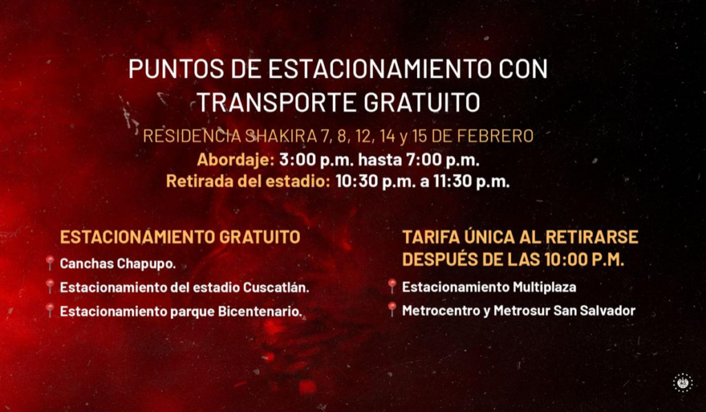 En cuanto al estacionamiento, el funcionario indicó que no estará permitido aparcar en las calles aledañas al estadio y que se habilitarán espacios específicos para los asistentes. Entre ellos mencionó las canchas Chapupo y el estacionamiento del estadio Cuscatlán, ambos de uso gratuito, así como Multiplaza, Metrocentro, Metrosur San Salvador y el estacionamiento de la avenida Los Andes, los cuales aplicarán una tarifa única para quienes salgan entre las 10:00 de la noche y las 2:00 de la madrugada. También estará disponible el parque Bicentenario, con ingreso por la avenida Jerusalén y uso gratuito.